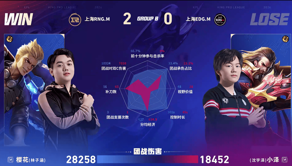 RNG.M/EDG.M第二局数据对比:雨空女娲玻璃大炮团战伤害拉满
