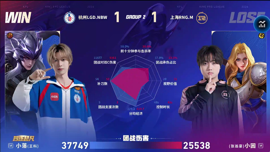 LGD 1-1 RNGM:小落马超四杀定胜局,LGD不甘落后扳回一城