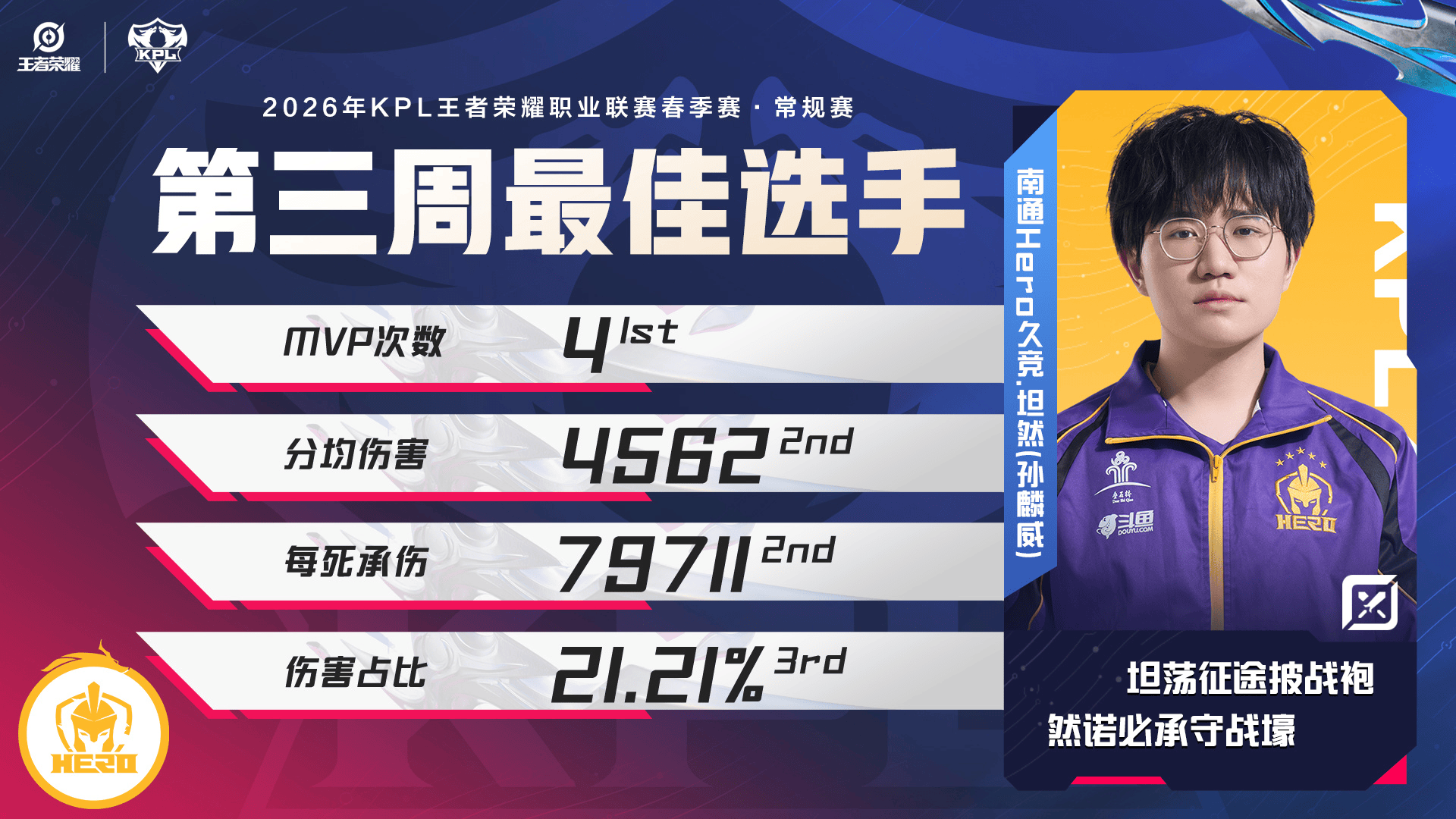 恭喜坦然斩获2026年KPL春季赛常规赛第三周最佳选手!