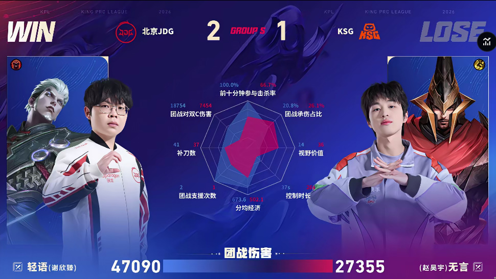 KSG/JDG第五局数据对比:无畏张飞承伤占比高达百分之四十