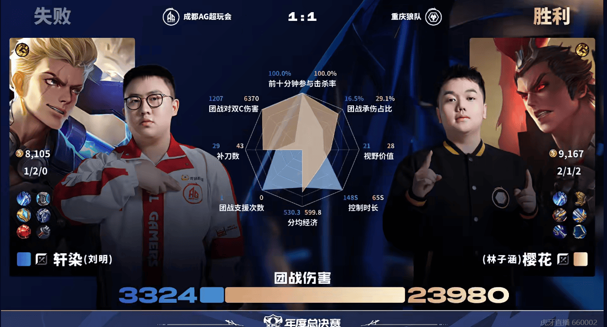 AG/狼队第二局数据图:一笙全包大帅,樱花吕布团战伤害拉满