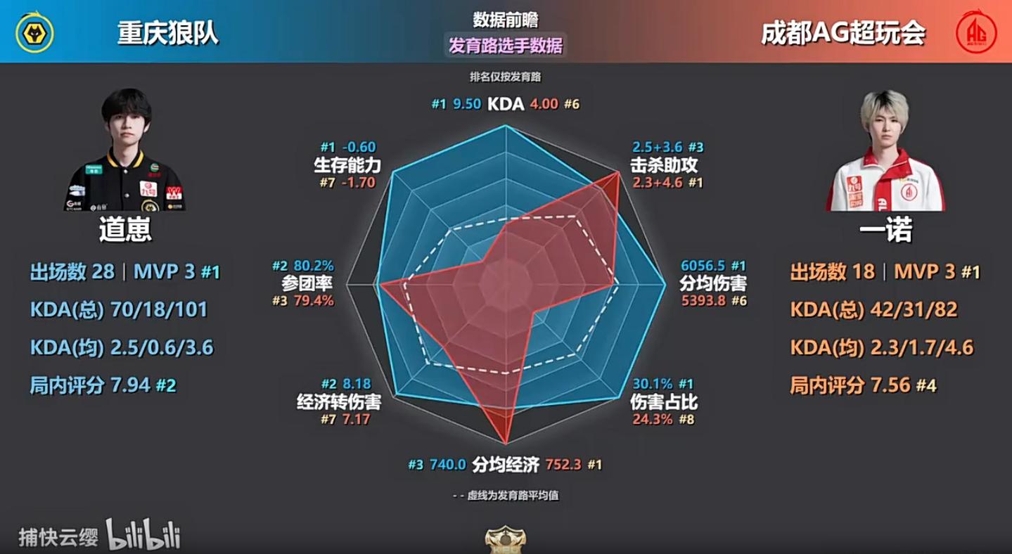 决赛发育路对位:一诺场均助攻同位置第一,道崽击杀第一