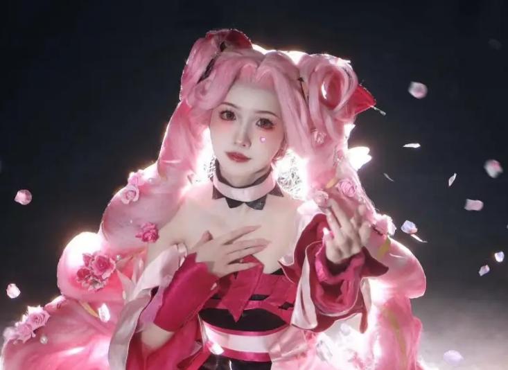 网红cos孙尚香,身穿白色丝袜,头戴粉红双马尾假发