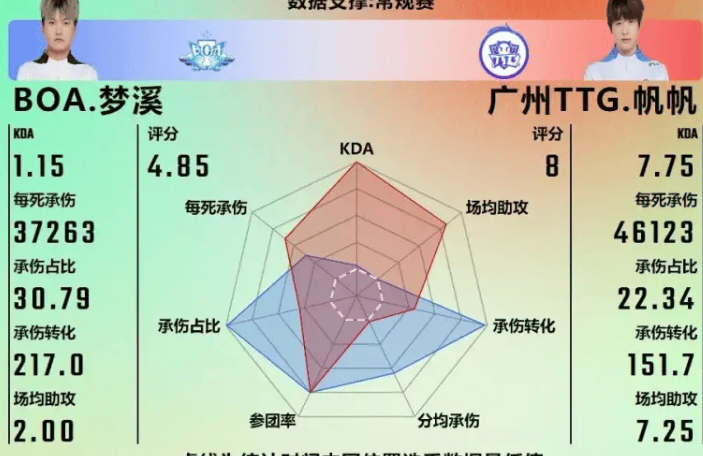 TTG 4-0 BOA赛后雷达图,哪组对位差距最大?