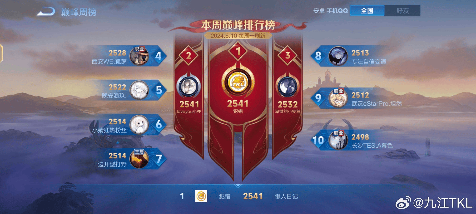 登顶巅峰赛,TKL发文:突然收到安雅发来消息,原来上第一了