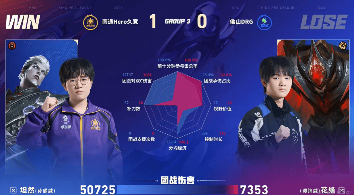 Hero/DRG第一局数据:坦然团战输出5w,双方射手各司其职