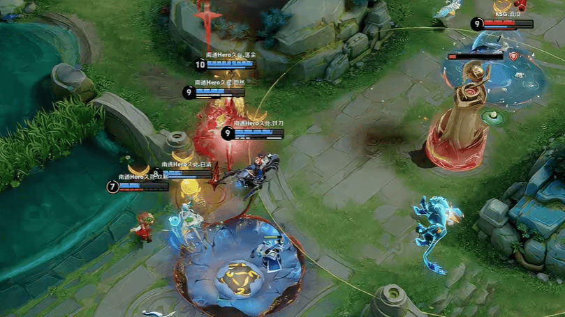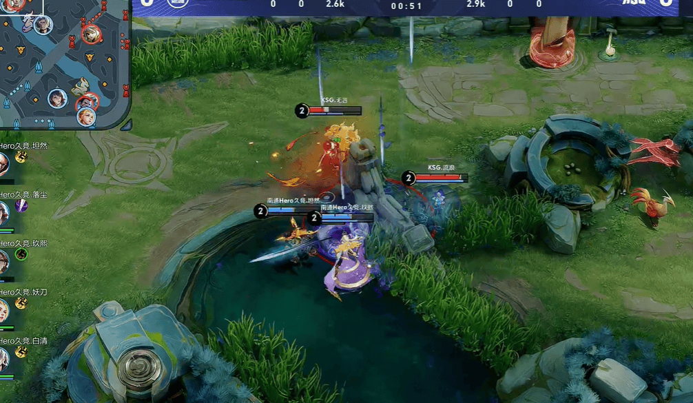 中路右侧河道,KSG空空儿先被收下,随后Hero追击0换2