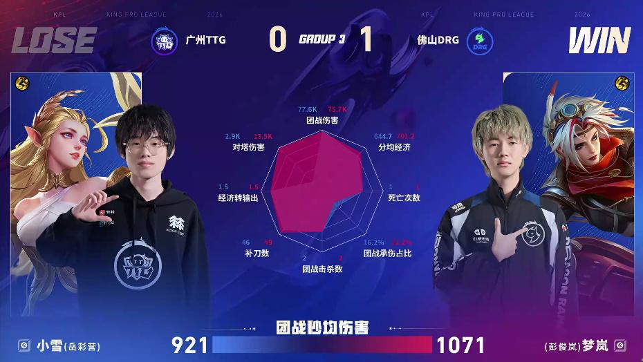 DRG/TTG第一局数据图:梦岚戈娅表现优异几乎包围小雪
