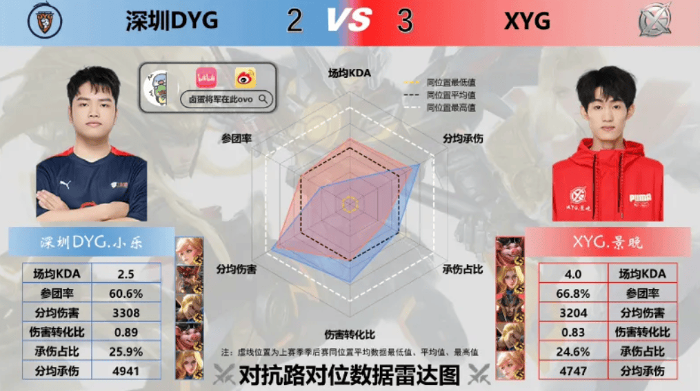 XYG 3:2 DYG赛后对位雷达图,哪一组差距最大?