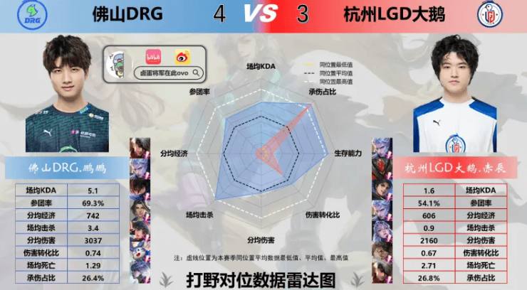 佛山DRG战胜杭州LGD赛后雷达图,哪组对位差距最大?