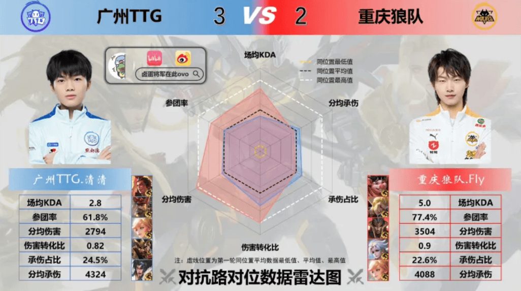 TTG 3:2 狼队对位数据雷达图,哪组对位差距最大?