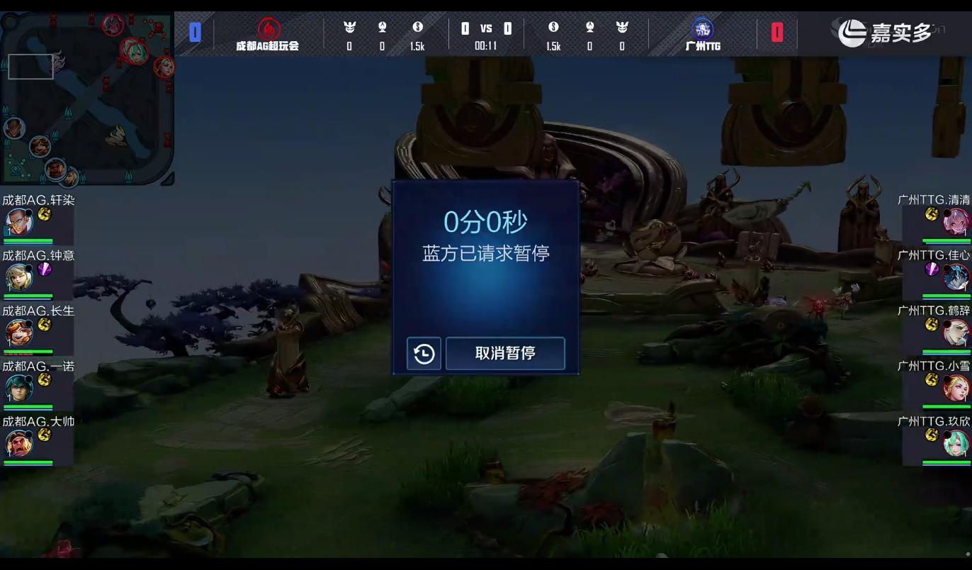 成都AG超玩会对阵广州TTG第一局比赛,开局进入暂停