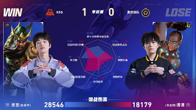KSG/狼第一局数据对比:句号大司命多项数据几乎完美