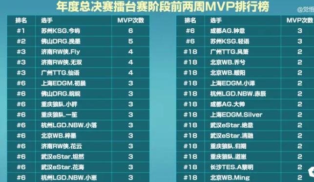 年总上两周MVP次数排行:今屿、挽墨、Fly前三