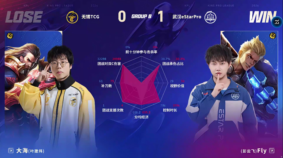 eStar/TCG第一局数据对比:Fly狂铁承伤占比高达百分之三十