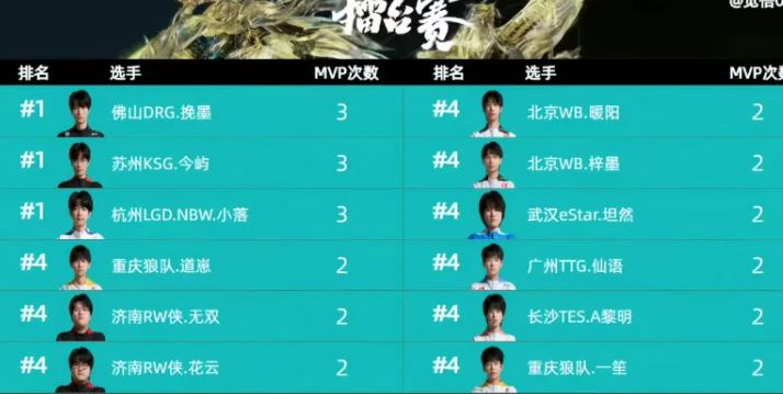 擂台赛第一周MVP次数排行:挽墨、今屿、小落前三