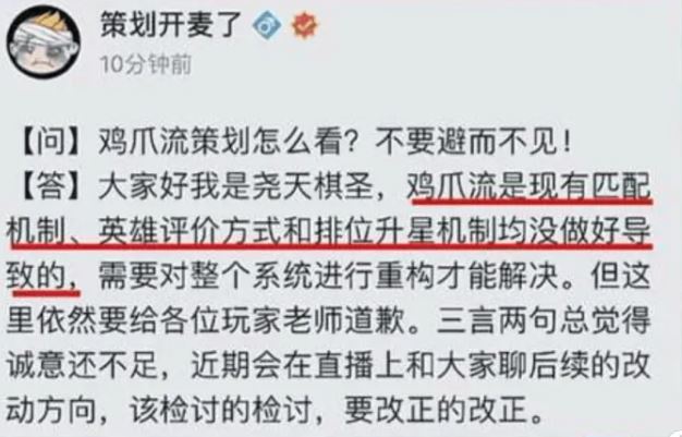 王者策划对鸡爪流做出回应,是匹配机制没做好导致的