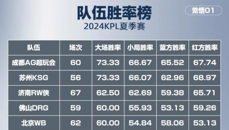 夏季赛队伍胜率榜:AG/KSG最高,RW侠紧随其后