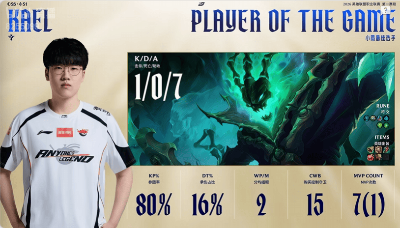 Kael锤石打出1/0/7战绩,拿到AL对阵IG赛点局MVP