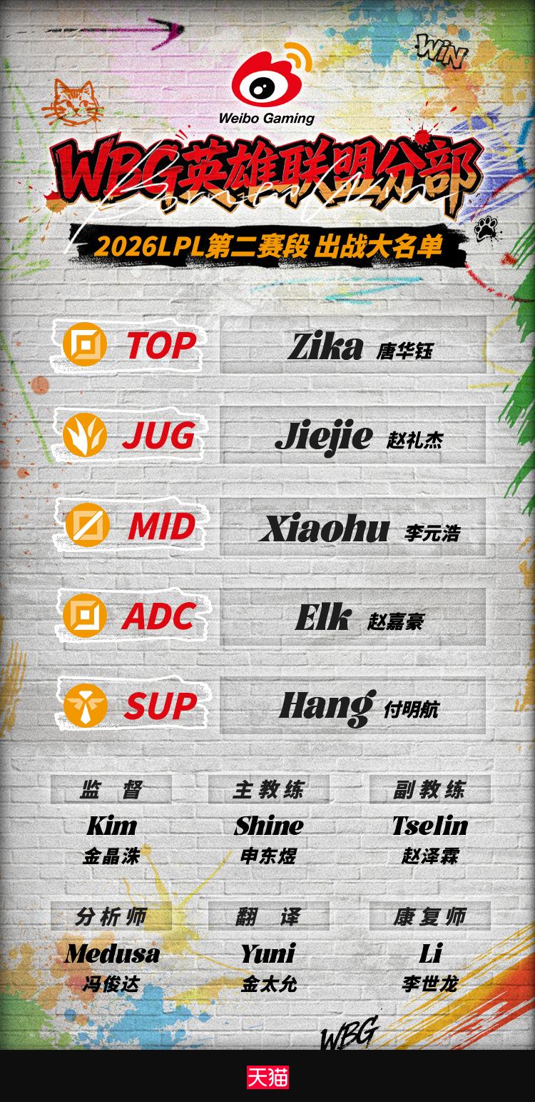 WBG发布2026LPL第二赛段大名单:辅助Hang再次回归队伍