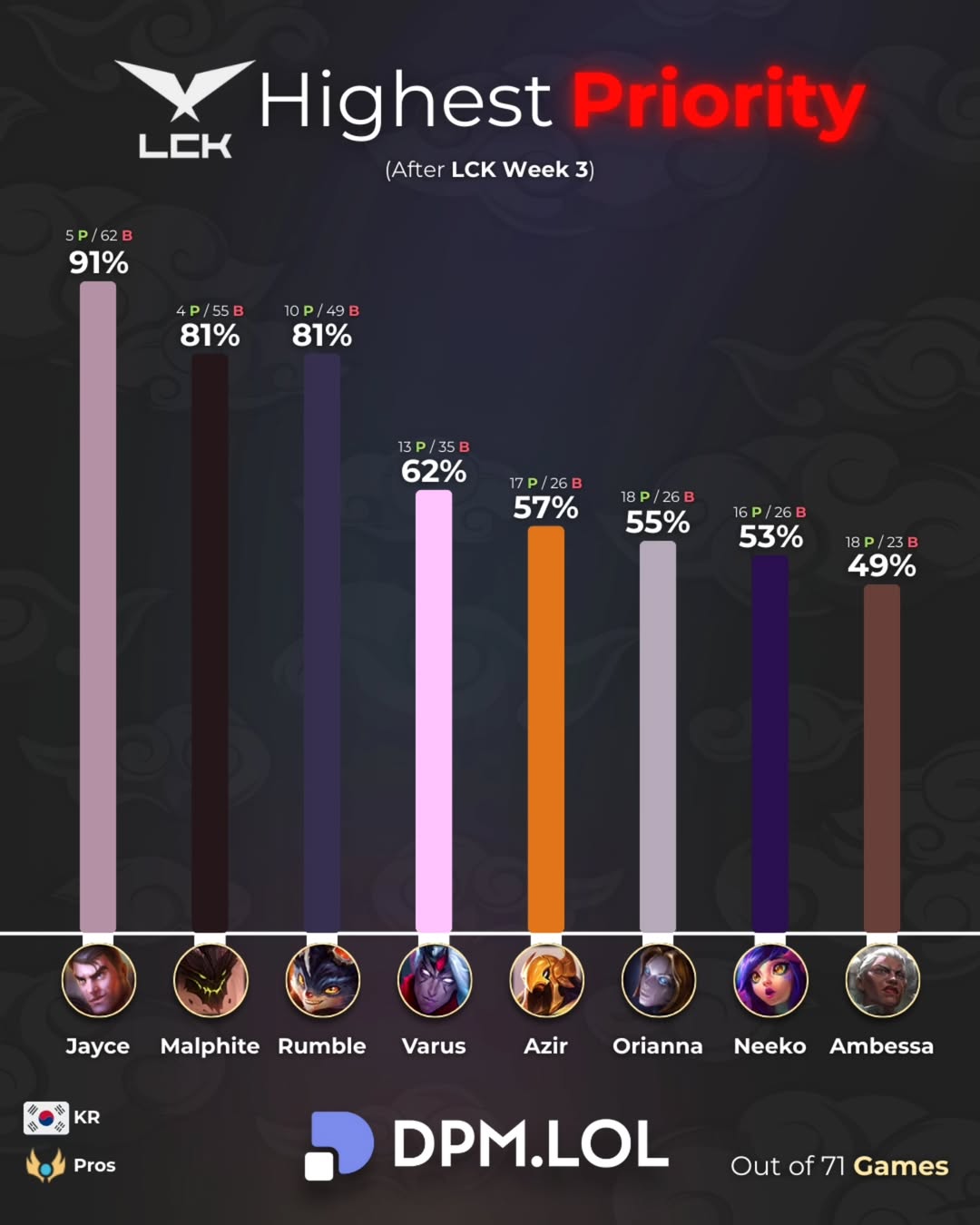 2026LCK杯前三周英雄优先级:杰斯第一,韦鲁斯上榜