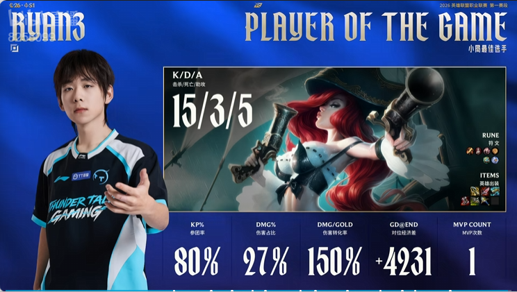 Ryan3女枪打出15/3/5战绩,拿到TT对阵EDG首局比赛MVP