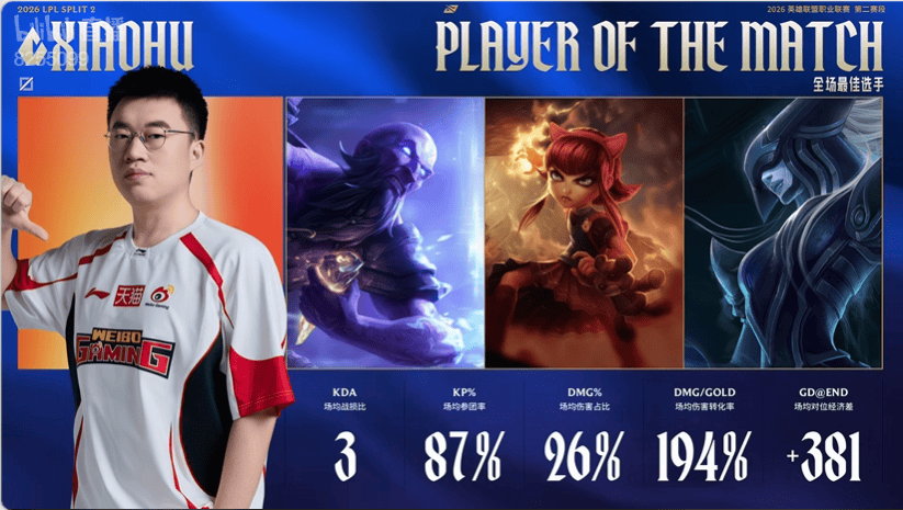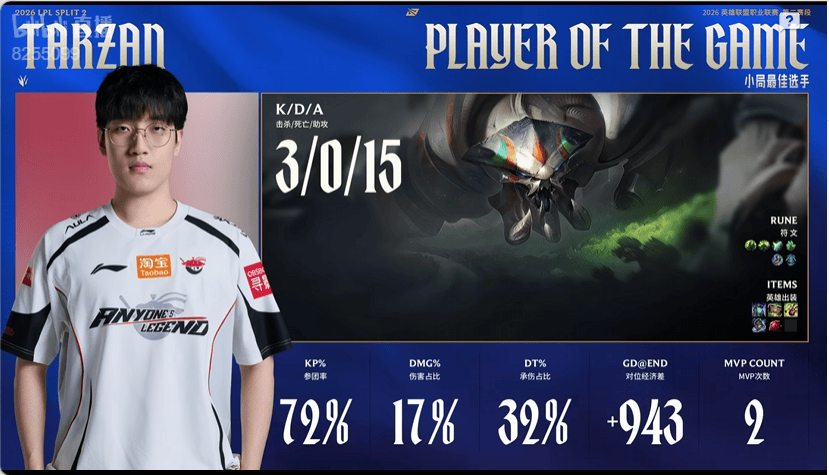Tarzan蝎子打出3/0/15战绩,拿到AL对阵WE首局比赛MVP