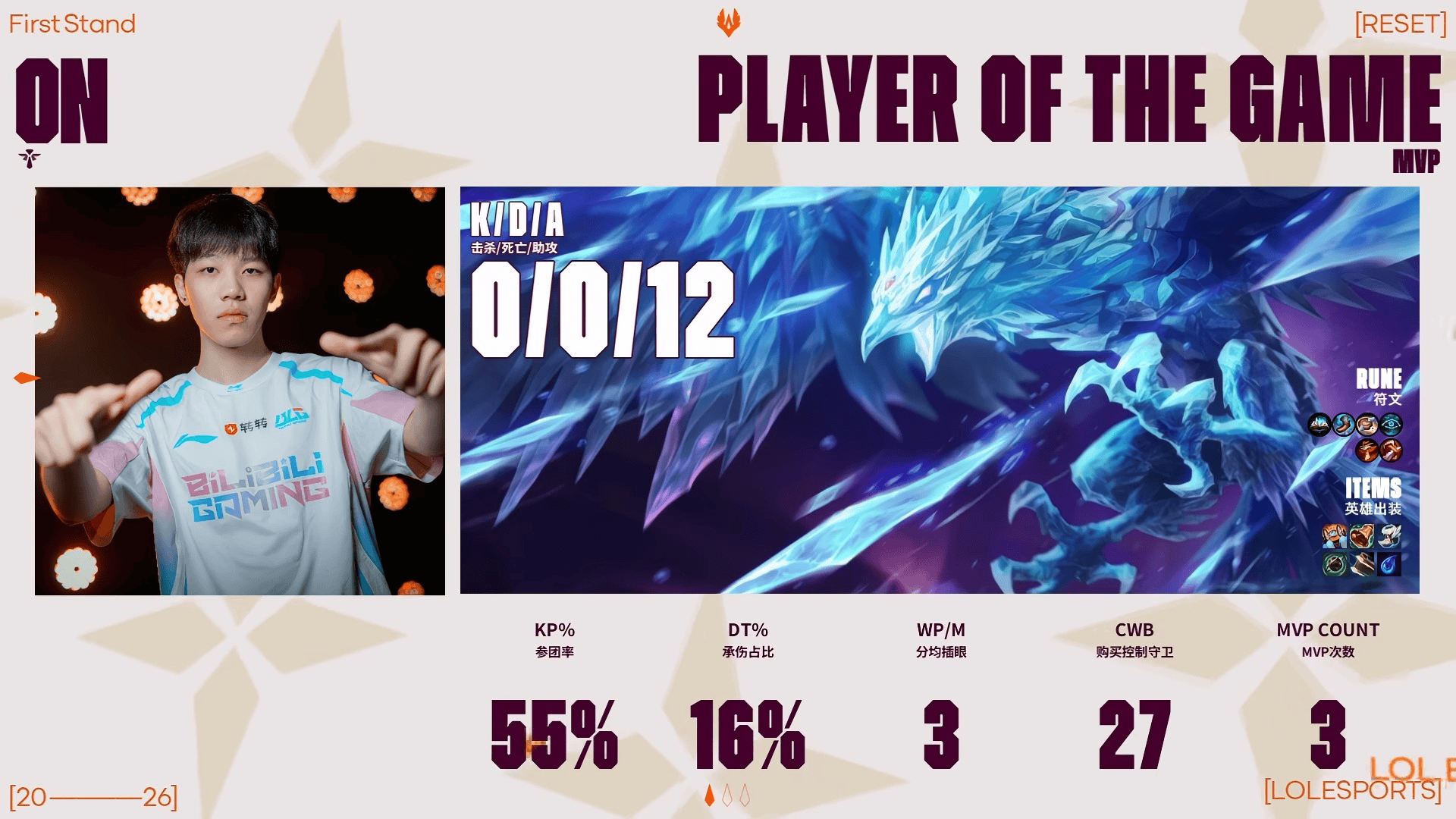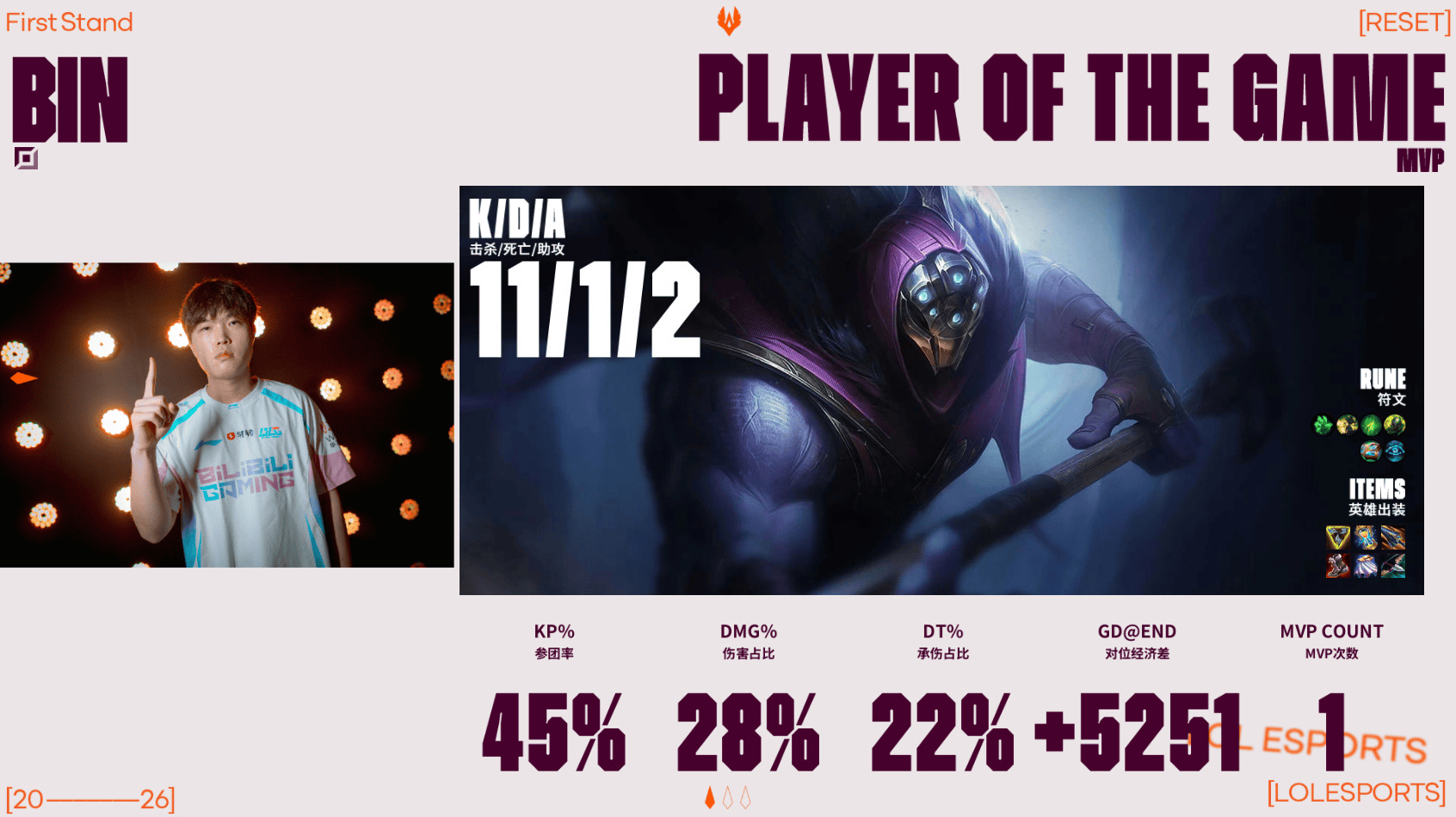 Bin贾克斯砍下11/1/2的战绩,拿下BLG对阵BFX第一局MVP