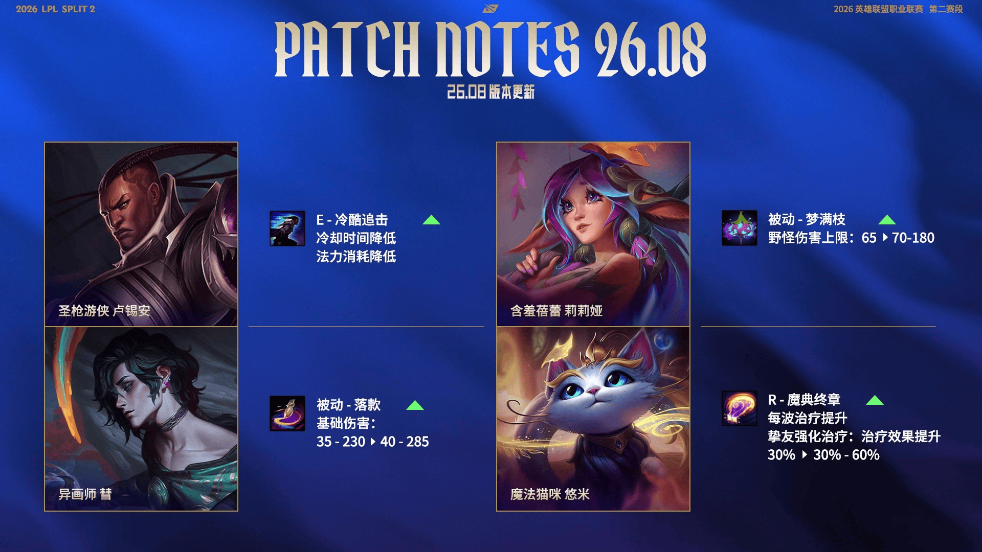 26.08赛场新版本更新:卢锡安、莉莉娅增强;梅尔、蒙多削弱