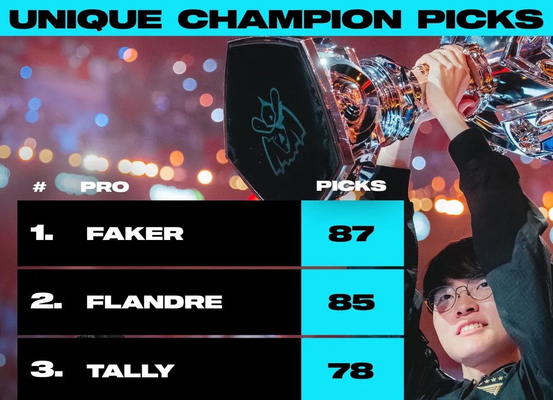 赛事官方分享英雄池前十选手:Faker、Flandre位居前二
