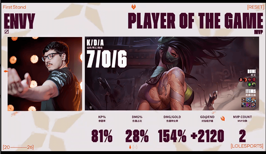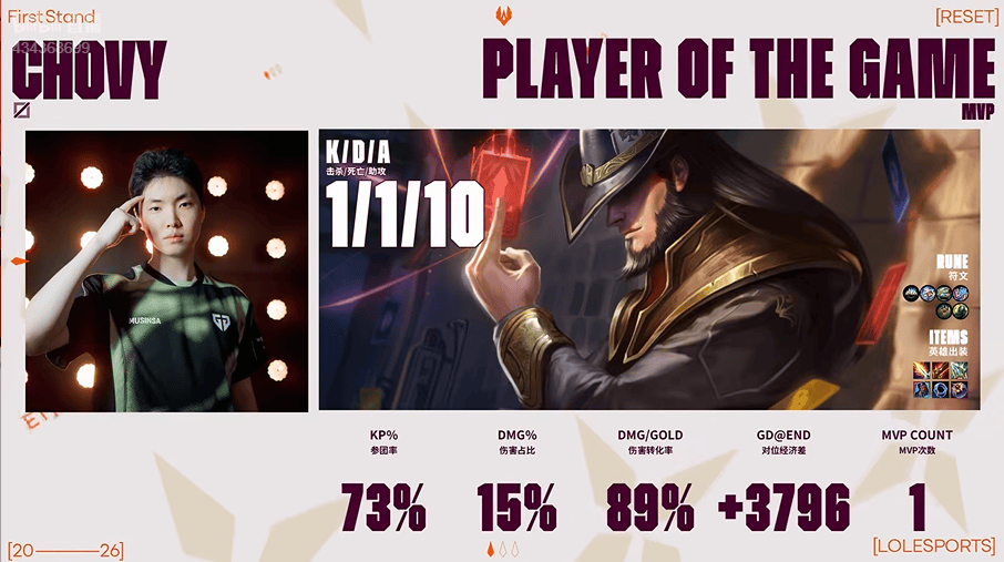 Chovy使用卡牌打出1/1/10战绩,斩获GEN对阵JDG第一局MVP