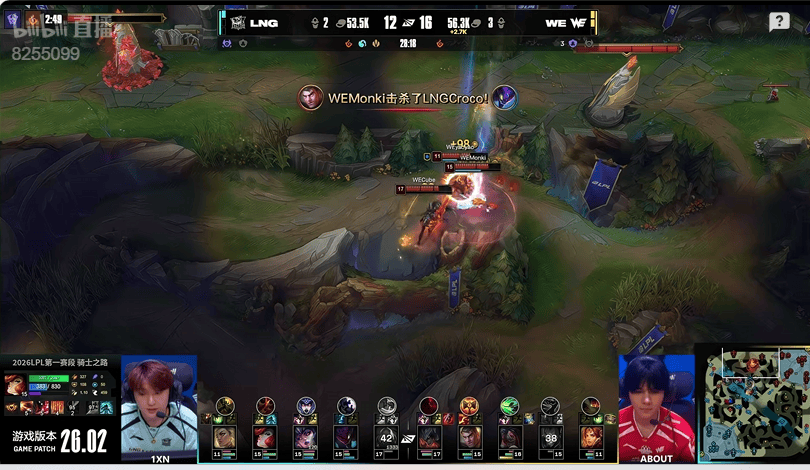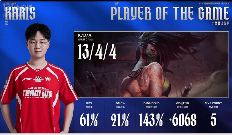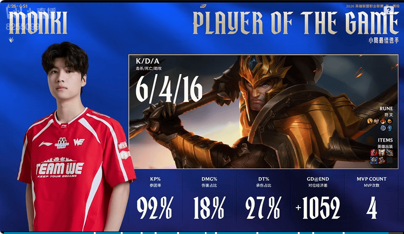 Monki皇子打出6/4/16战绩,拿到WE对阵LNG首局比赛MVP