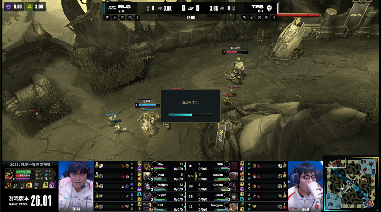 TES对阵BLG第一局,因Fengyue设备问题发生暂停(已恢复)
