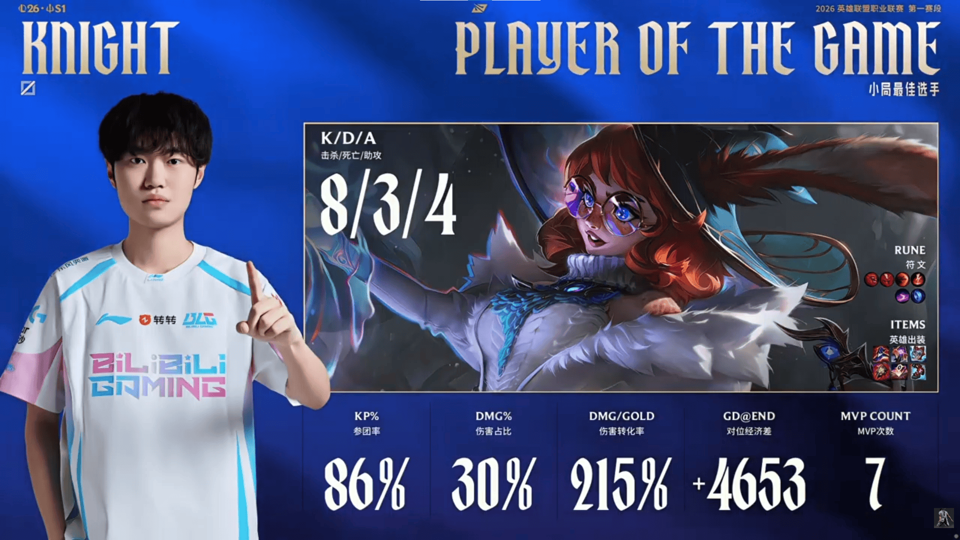 Knight阿萝拉砍下8/3/4的战绩,拿下BLG对阵JDG次局MVP