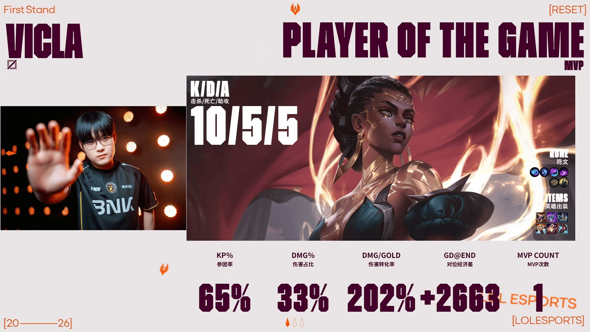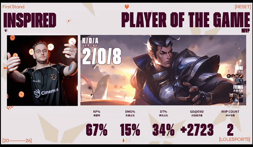 VicLa梅尔砍下10/5/5的战绩,拿下BFX对阵BLG第三局MVP