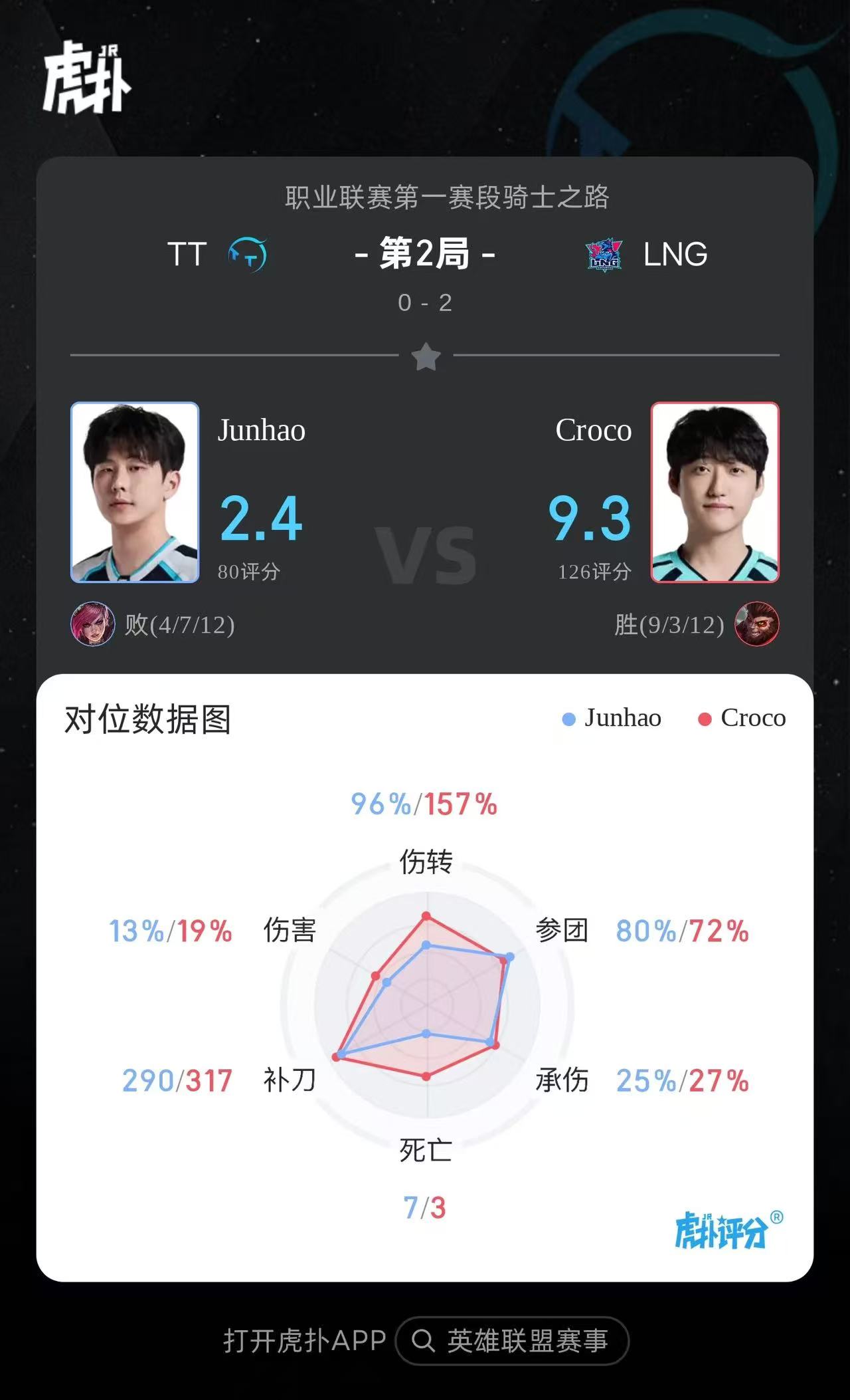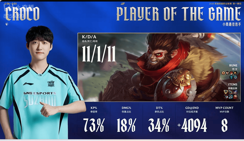 Croco猴子打出9/3/12战绩,斩获LNG对阵TT第二局MVP