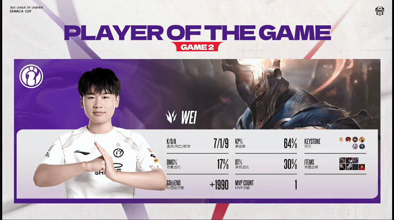 Wei潘森打出7/1/9战绩,斩获IG对阵LGD第二局MVP