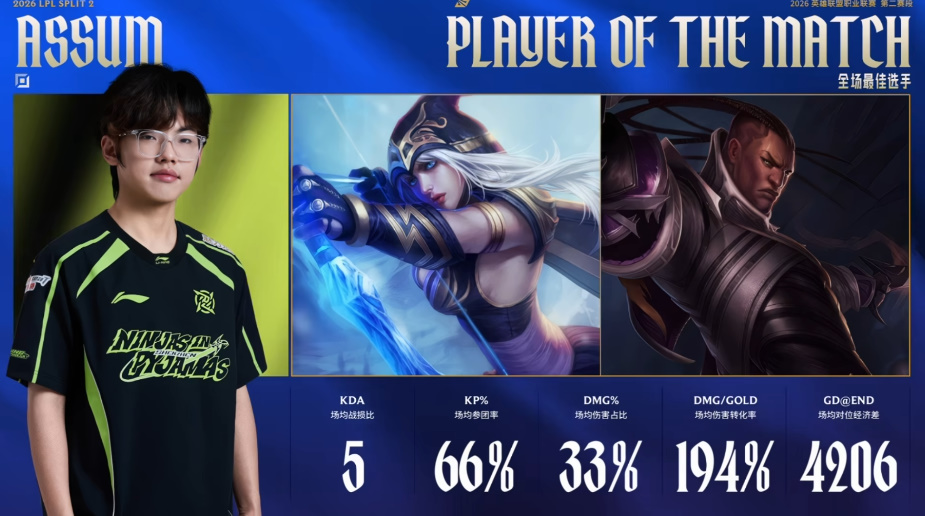 Assum艾希/卢锡安发挥出色,斩获NIP对战BLG系列赛POM