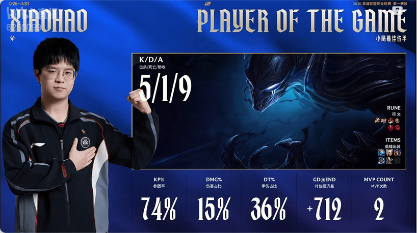 Xiaohao梦魇打出5/1/9战绩,拿到EDG对阵WE首局比赛MVP