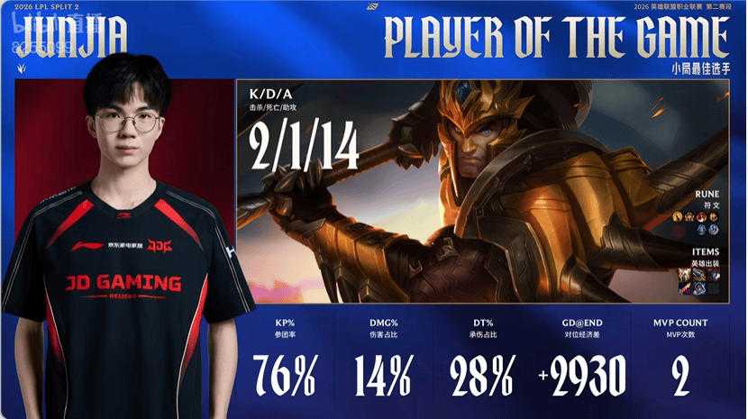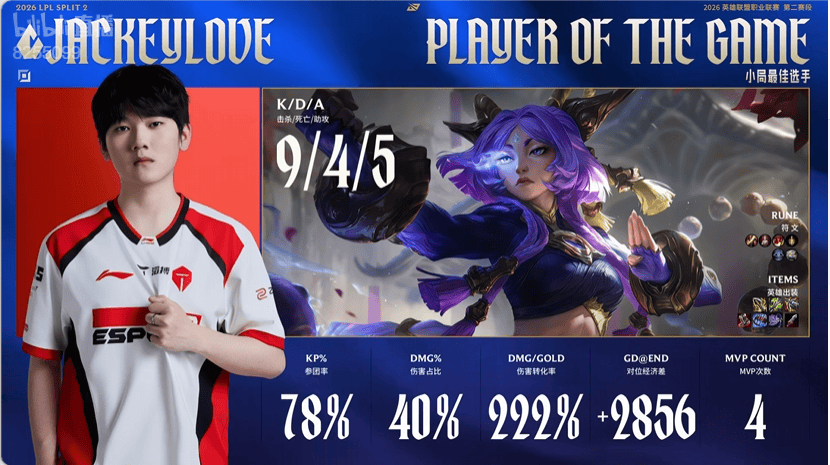 Jiejie潘森打出6/0/9战绩,拿到WBG对阵JDG首局比赛MVP