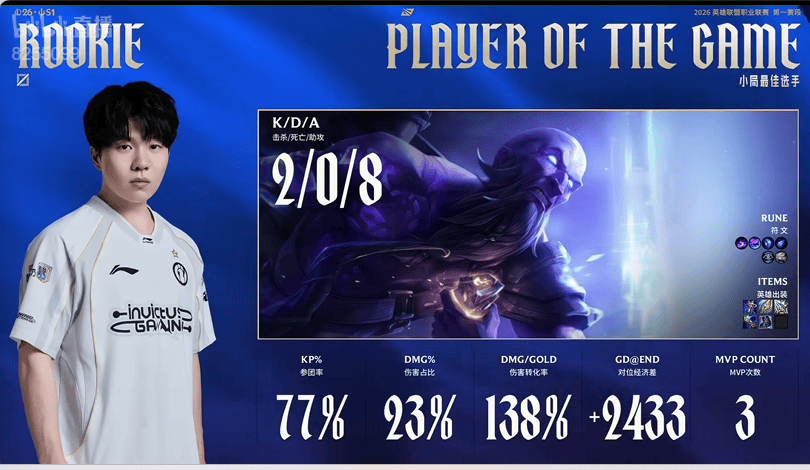 Rookie塞拉斯打出6/1/9战绩,拿到IG对阵OMG首局比赛MVP