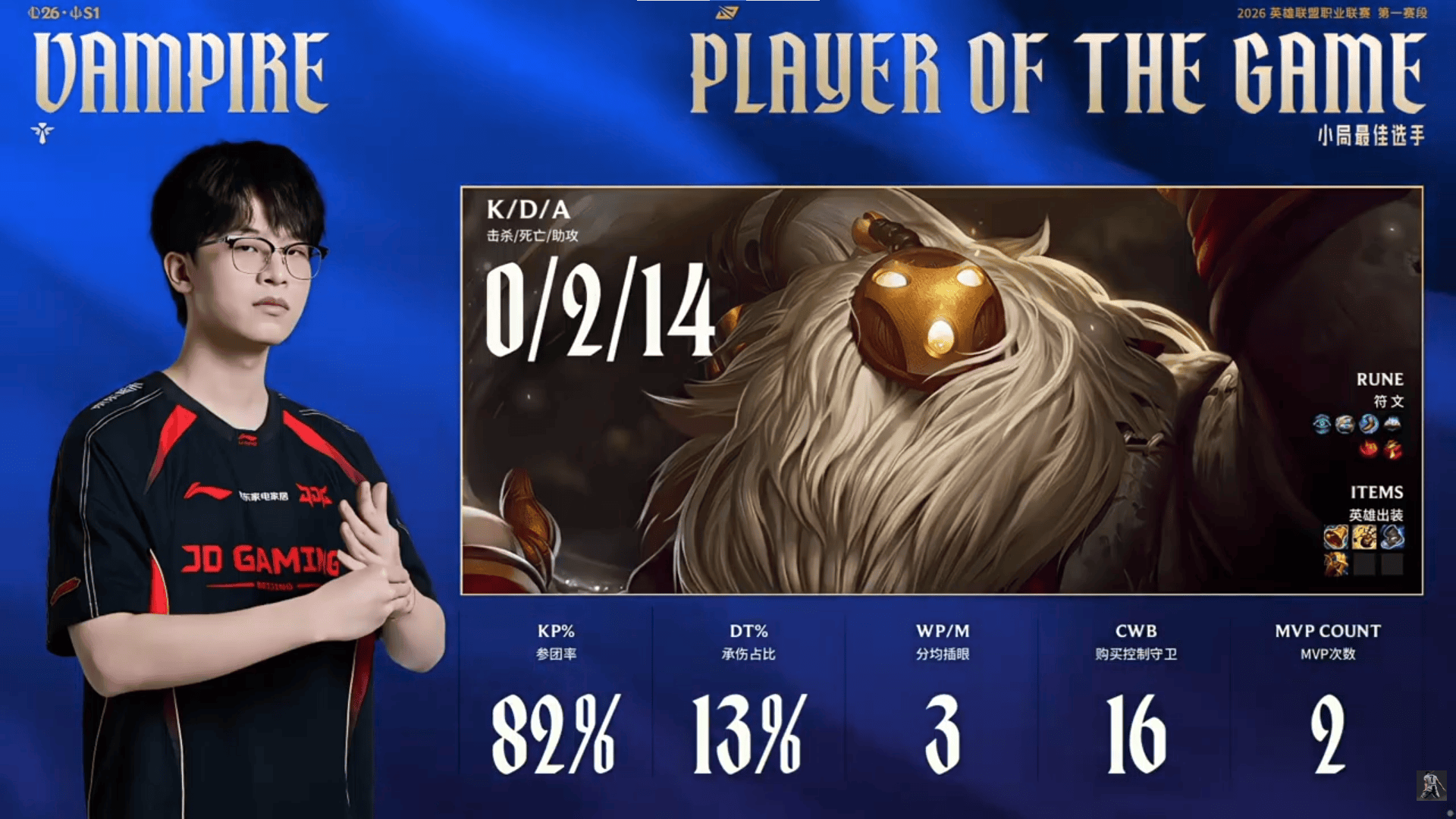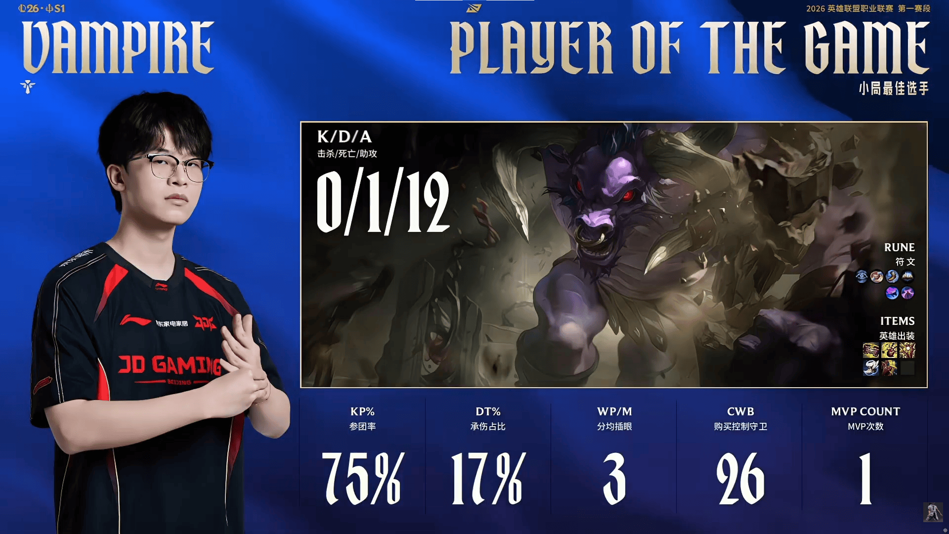 Vampire牛头砍下0/1/12的战绩,拿下JDG对阵BLG首局MVP