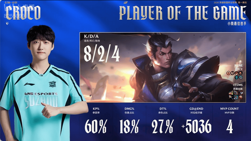 Croco赵信打出8/2/4战绩,拿到LNG对阵OMG首局比赛MVP