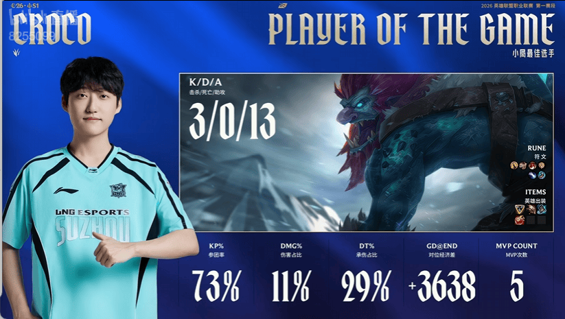 Croco巨魔打出3/0/13战绩,拿到LNG对阵OMG比赛次局MVP
