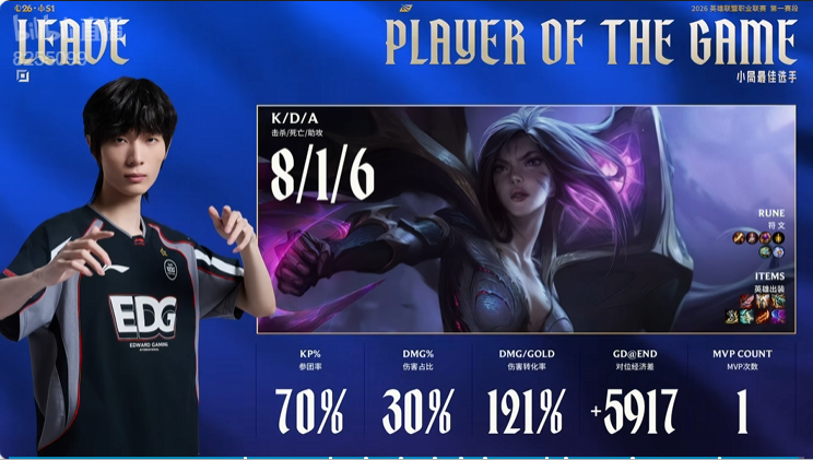 Leave卡莎打出8/1/6战绩,拿到EDG对阵TT次局比赛MVP
