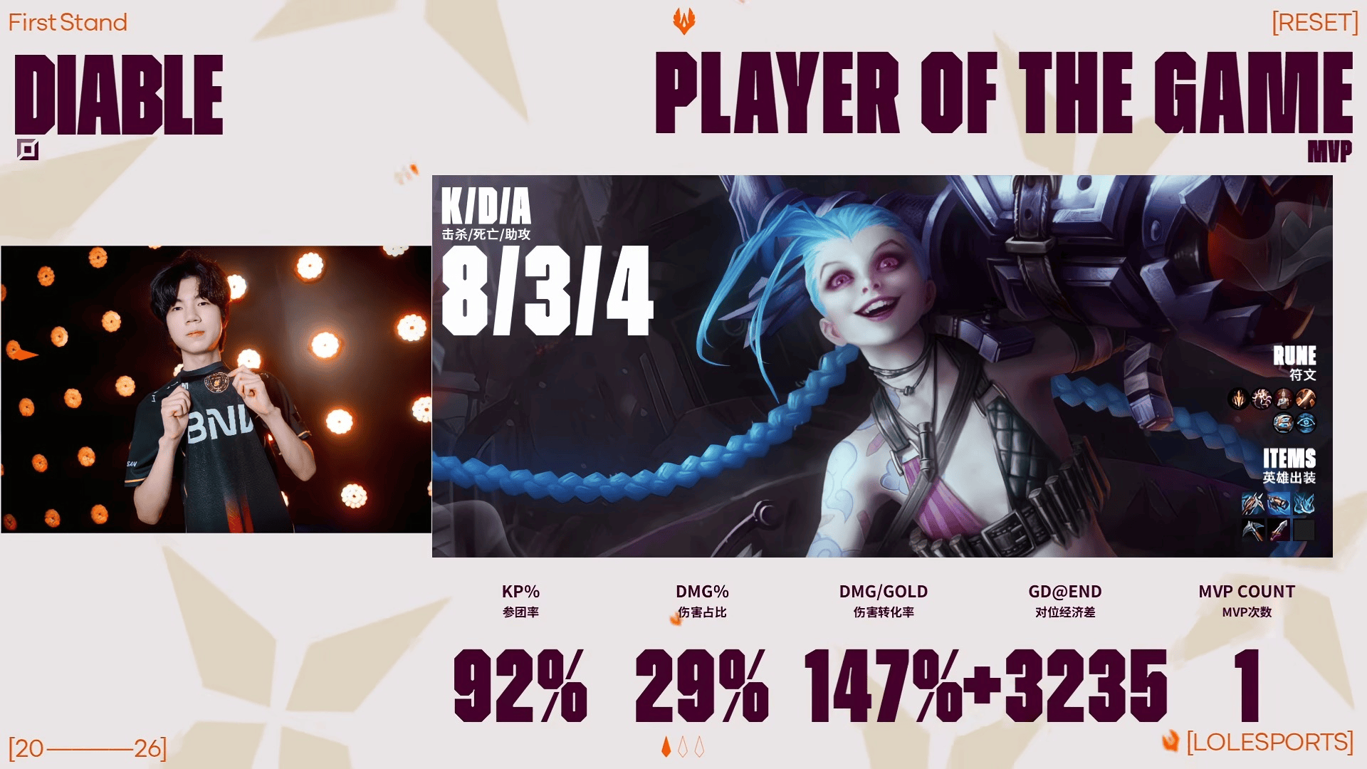 Diable金克丝砍下8/3/4的战绩,拿下BFX对阵BLG第二局MVP
