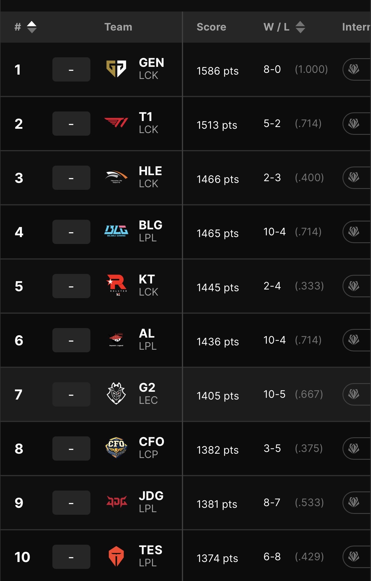 最新全球战力榜:GEN、T1、HLE前三;BLG、AL分列第四第六