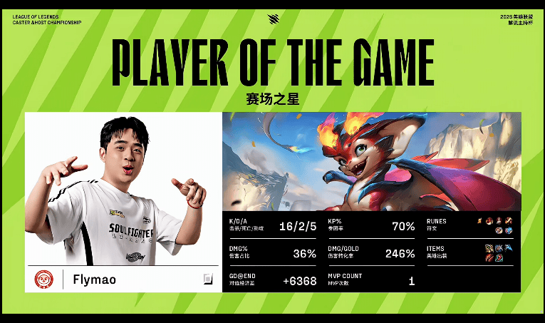 毛毛使用小火龙打出16/2/5战绩,斩获GWS对阵DBG第一局MVP