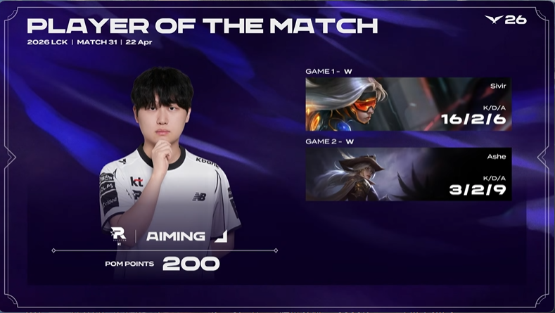 Aiming整个系列赛发挥出色,斩获KT对阵KRX系列赛POM
