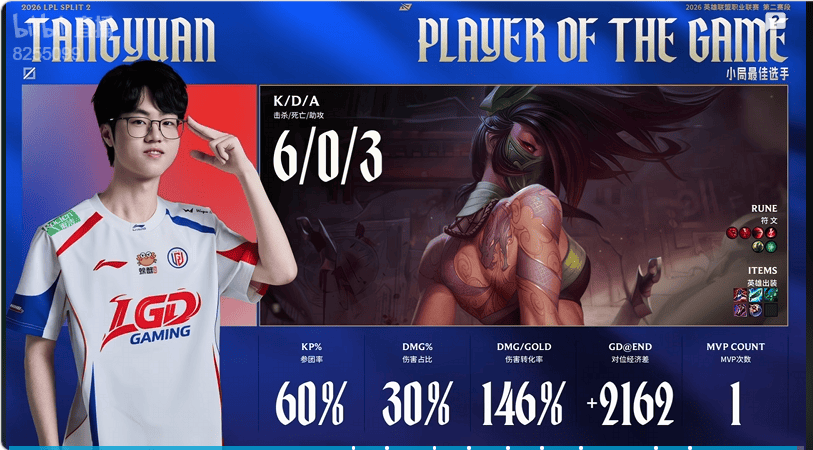 Tangyuan阿卡丽打出6/0/3战绩,拿到LGD对阵EDG首局比赛MVP